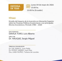 El Lunes 04 de mayo de 2026 a las 15:00 hs., Luis Alberto DAVILA TORO defenderá su tesis 'Estudio del Impacto de la Inversión en Educación Superior sobre las Finanzas Públicas Ecuatorianas y sus principales Efectos Económicos. Periodo 1980 – 2020'.
