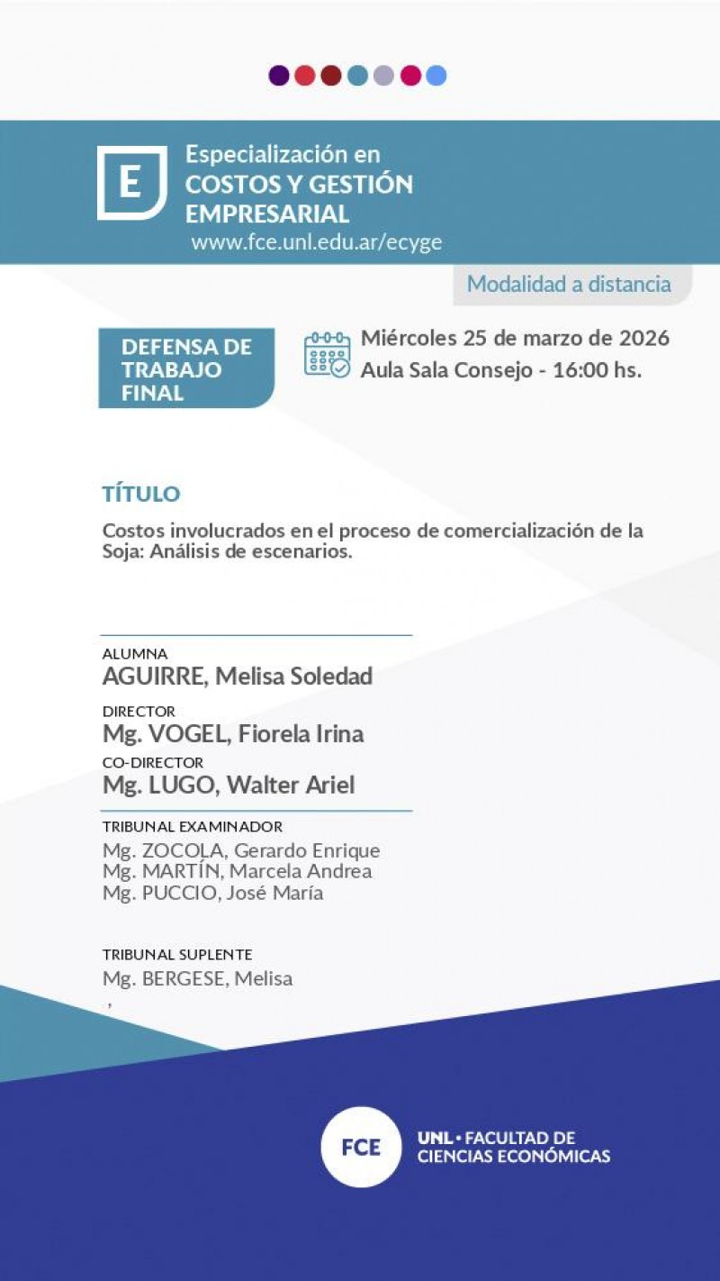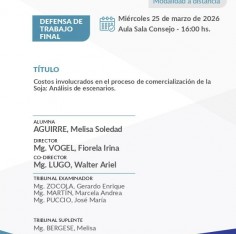 El Miércoles 25 de marzo de 2026 a las 16:00 hs., Melisa Soledad AGUIRRE defenderá su trabajo 'Costos involucrados en el proceso de comercialización de la Soja: Análisis de escenarios.'