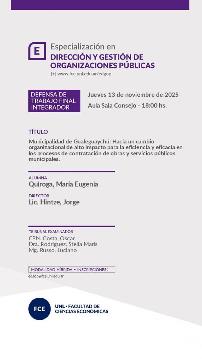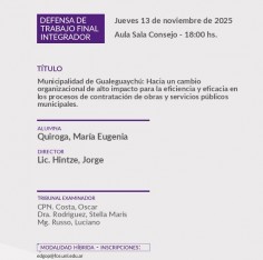 El Jueves 13 de noviembre de 2025 a las 18:00 hs., María Eugenia Quiroga defenderá su trabajo 'Municipalidad de Gualeguaychú: Hacia un cambio organizacional de alto impacto para la eficiencia y eficacia en los procesos de contratación de obras y servicios públicos municipales.'