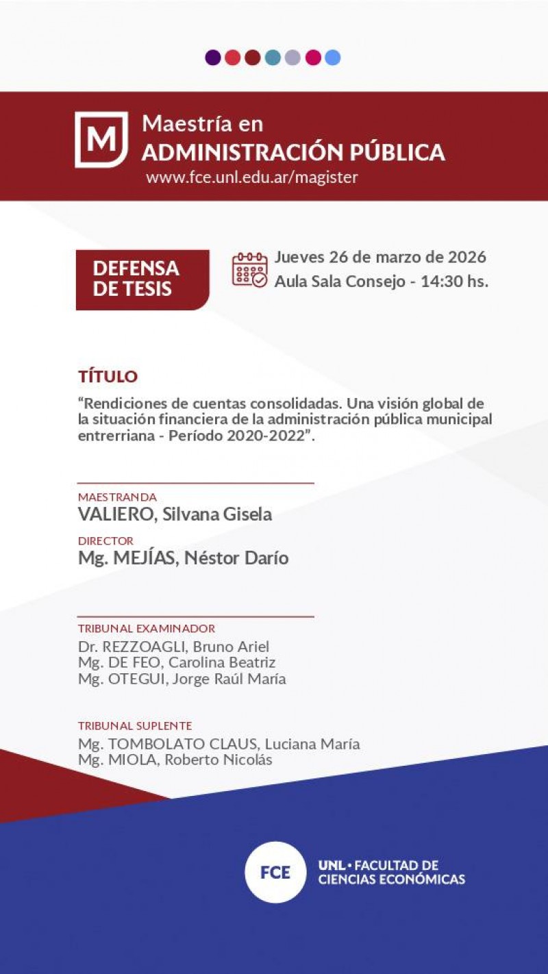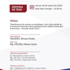 El Jueves 26 de marzo de 2026 a las 14:30 hs., Silvana Gisela VALIERO defenderá su tesis '“Rendiciones de cuentas consolidadas. Una visión global de la situación financiera de la administración pública municipal entrerriana - Período 2020-2022”.'