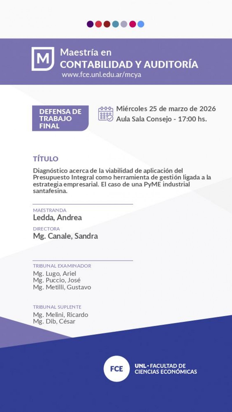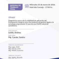 El Miércoles 25 de marzo de 2026 a las 17:00 hs., Andrea Ledda defenderá su trabajo 'Diagnóstico acerca de la viabilidad de aplicación del Presupuesto Integral como herramienta de gestión ligada a la estrategia empresarial. El caso de una PyME industrial santafesina.'