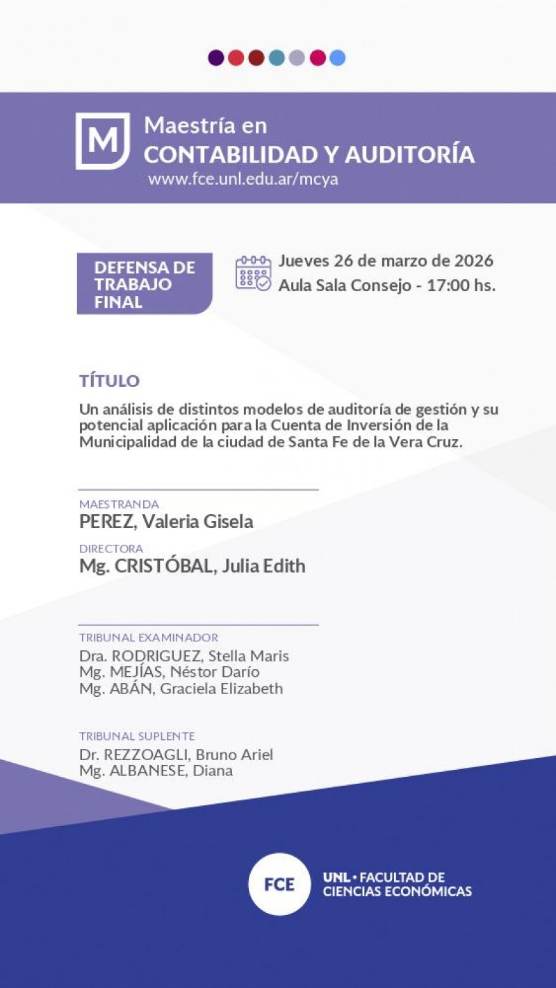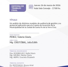 El Jueves 26 de marzo de 2026 a las 17:00 hs., Valeria Gisela PEREZ defenderá su trabajo 'Un análisis de distintos modelos de auditoría de gestión y su potencial aplicación para la Cuenta de Inversión de la Municipalidad de la ciudad de Santa Fe de la Vera Cruz.'
