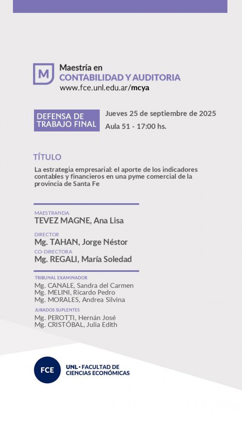 El Jueves 25 de septiembre de 2025 a las 17:00 hs., Ana Lisa TEVEZ MAGNE defenderá su trabajo 'La estrategia empresarial: el aporte de los indicadores contables y financieros en una pyme comercial de la provincia de Santa Fe'.