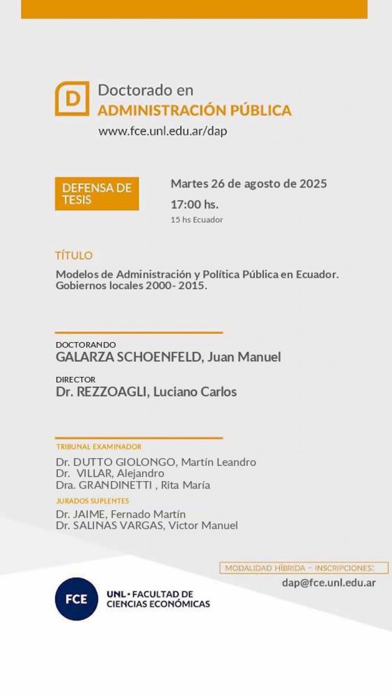 El Martes 26 de agosto de 2025 a las 17:00 hs., Juan Manuel GALARZA SCHOENFELD defenderá su tesis 'Modelos de Administración y Política Pública en Ecuador. Gobiernos locales 2000- 2015.'
