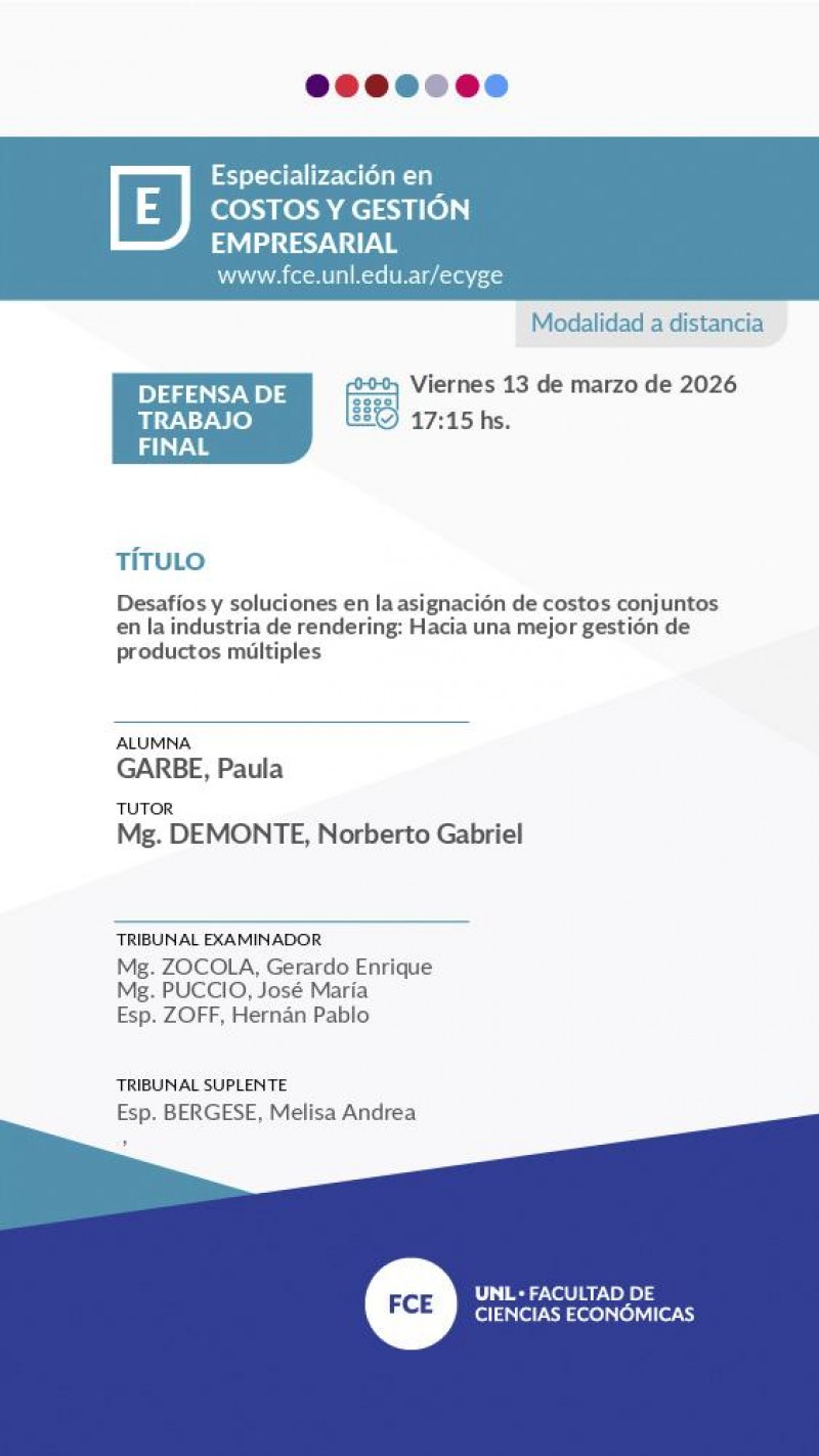 - a las 17:15 hs., Paula GARBE defenderá su trabajo 'Desafíos y soluciones en la asignación de costos conjuntos en la industria de rendering: Hacia una mejor gestión de productos múltiples'