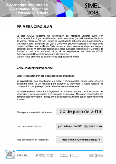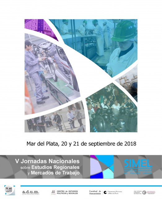 La Red SIMEL (Sistema de Información del Mercado Laboral) junto con la Carrera de Sociología de la Facultad de Humanidades (de la Universidad Nacional de Mar del Plata) , y el Grupo de Investigación sobre Trabajo, Estratificación y Movilidad Social, integrante del CEPS Centro de estudios Sociales y Políticos de la Universidad Nacional de Mar del Plata, convocan a la presentación de ponencias para participar en las V Jornadas Nacionales sobre Estudios Regionales y Mercado de Trabajo a realizarse los días 20 y 21 de septiembre de 2018 en la Agremiación de Docentes de la Universidad Nacional de Mar del Plata (ADUM) Mar del Plata, provincia de Buenos Aires, República Argentina.