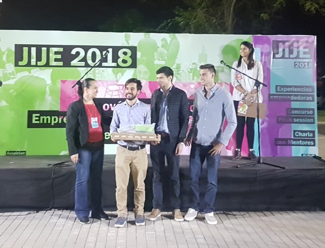 Los estudiantes Marcos Bermúdez, Gastón Gianre y Juan Pablo Varela obtuvieron el Primer Premio al mejor Modelo de Negocios en las Jornadas Internacionales de Jóvenes Emprendedores 2018.