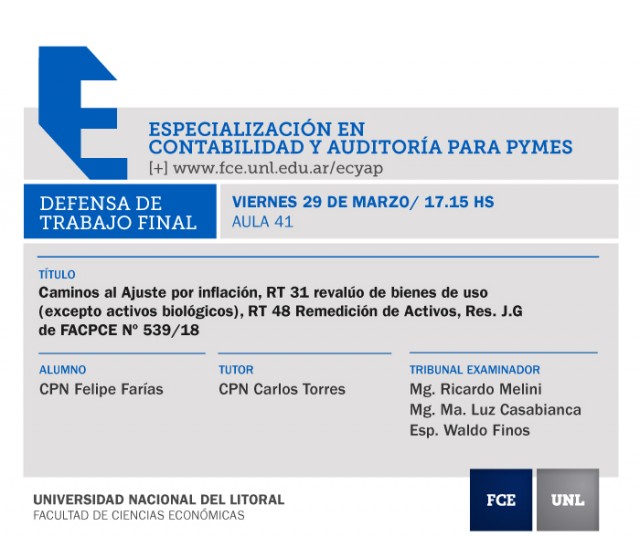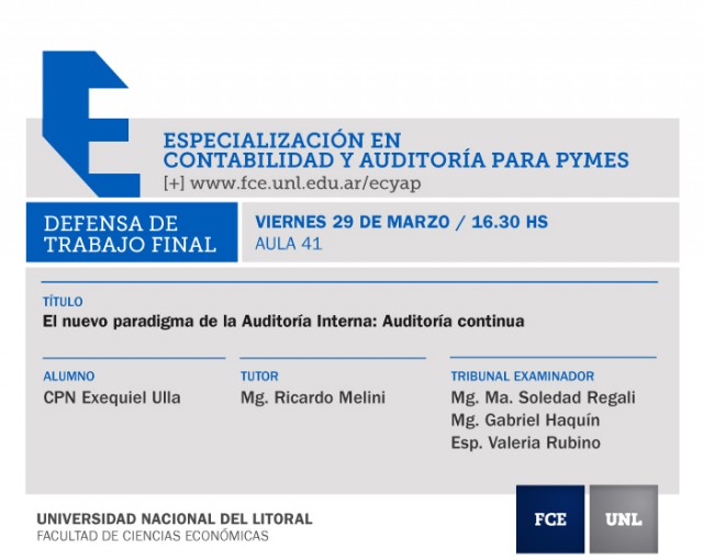 El 29 de marzo se realizarán tres defensas de trabajos finales de la Especialización en Contabilidad y Auditoría para Pymes.