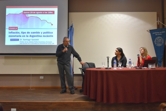 Con la presencia de docentes, graduados, estudiantes y público en general, el Decano de la Facultad presentó al Dr. Santiago Gastaldi quien disertó en el auditorio de la institución acerca de "Inlfación, tipo de cambio y política monetaria de la Argentina reciente".