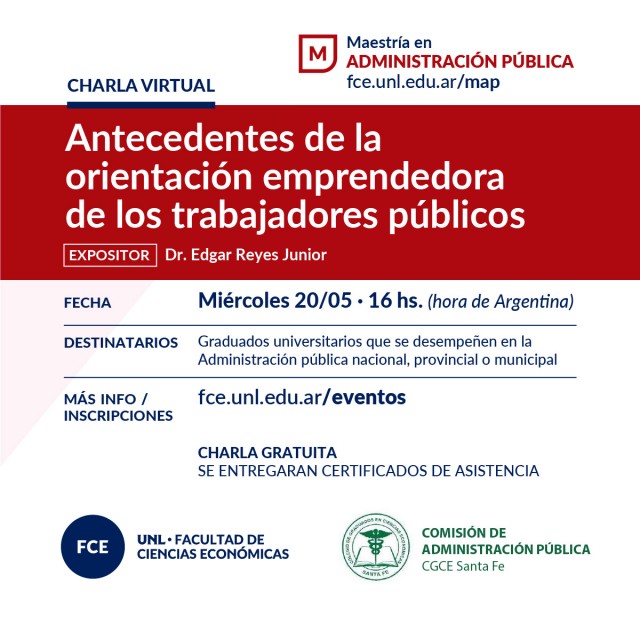 El próximo miércoles 20 de mayo a las 16:00 se llevará a cabo la charla virtual "Antecedentes de la orientación emprendedora de los trabajadores públicos".