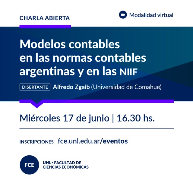 El miércoles 17 de junio a las 16.30 hs. el profesor Alfredo Zgaib de la Universidad de Comahue disertará en forma virtual sobre "Modelos contables en las normas contables argentinas y en las NIIF”.