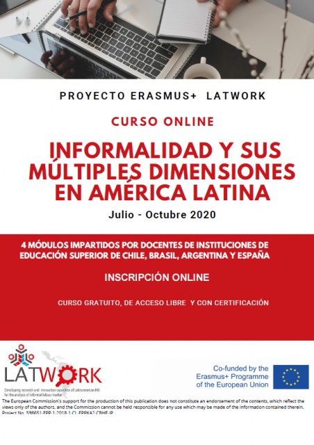 En el marco de la ejecución del proyecto Erasmus+ LATWORK se organizó el curso virtual "Informalidad y sus múltiples dimensiones en América Latina". El mismo será impartido por docentes de Instituciones de Educación Superior que trabajan en la temática, procedentes de Chile, Brasil, Argentina y España.
