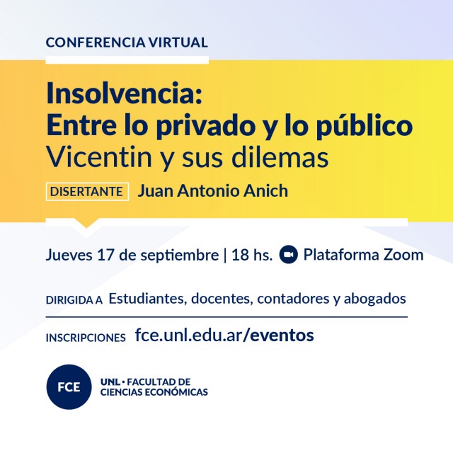 El jueves 17 de septiembre a las 18 hs. se brindará la conferencia virtual "Insolvencia: entre lo privado y lo público", por el Dr. Juan Antonio Anich.