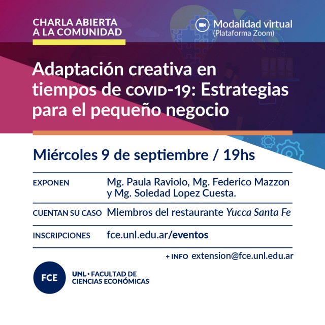 El miércoles 9 de septiembre a las 19:00 se llevará a cabo la charla abierta a la comunidad: "Adaptación creativa en tiempos de COVID19: estrategias para el pequeño negocio".