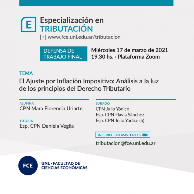 - 19:30 hs: "El ajuste por inflación impositivo: análisis a la luz de los principios del Derecho Tributario", por la alumna CPN Mara Florencia Uriarte