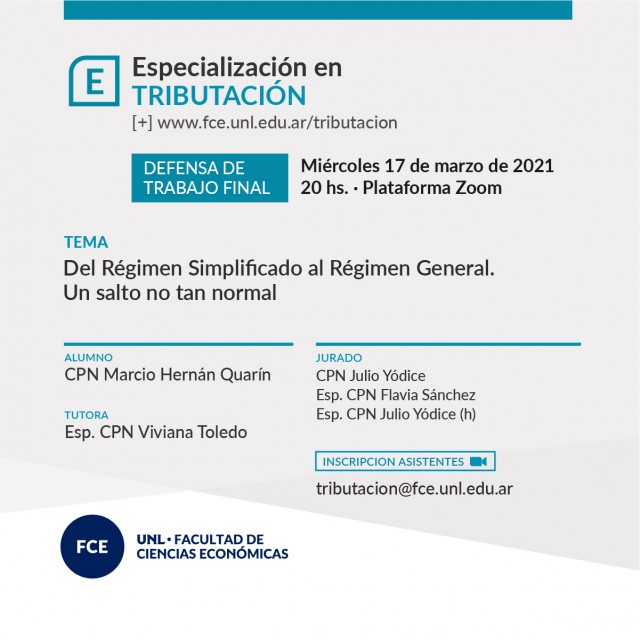 - 20:00 hs: "Del Régimen Simplificado al Régimen General. Un salto no tan normal", por el alumno CPN Mario Hernán Quarín