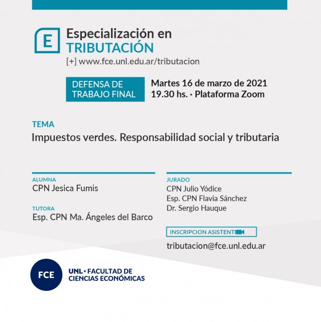 - 19:30 hs: "Impuestos verdes. Responsabilidad social y tributaria", por la alumna CPN Jesica Fumis