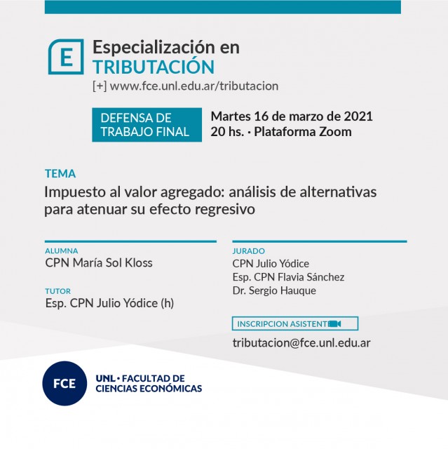 - 20:00 hs: "Impuesto al valor agregado: análisis de alternativas para atenuar su efecto regresivo", por la alumna CPN María Sol Kloss