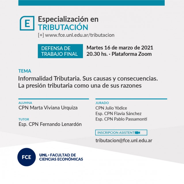 - 20:30 hs: "Informalidad tributaria. Sus causas y consecuencias. La presión tributaria como una de sus razones", por la alumna CPN Marta Viviana Urquiza