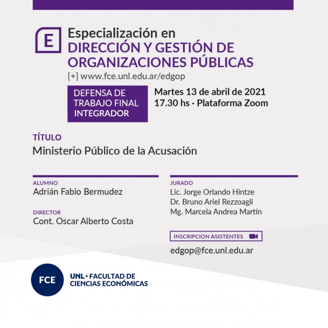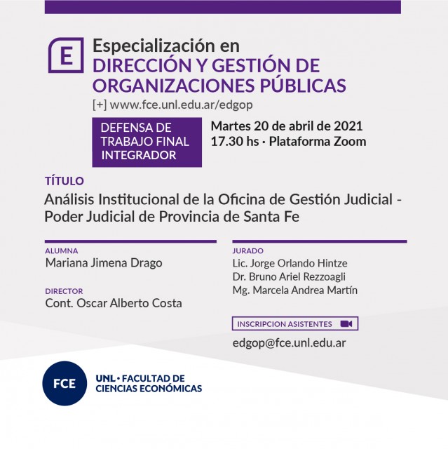 - 17:30 hs. "Análisis Institucional de la Oficina de Gestión Judicial - Poder Judicial de la Provincia de Santa Fe", por la alumna Mariana Jimena Drago