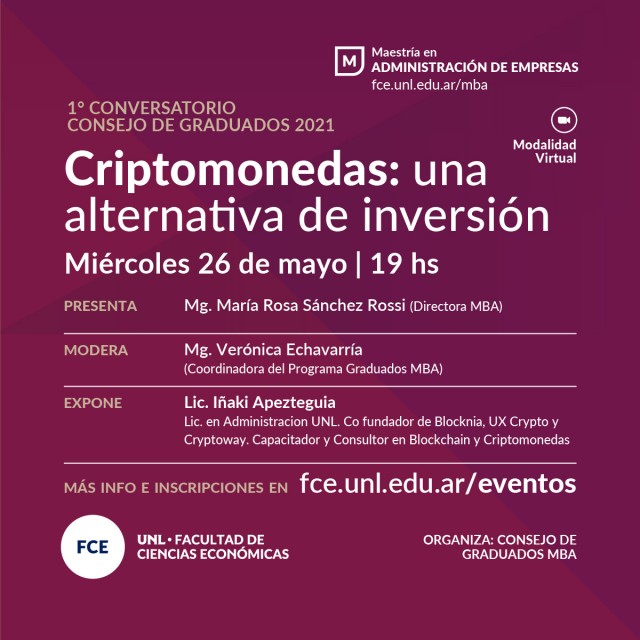 El miércoles 26 de mayo a las 19 hs se llevará a cabo el 1º Conversatorio 2021 del Consejo de Graduados del MBA, titulado: "Criptomonedas: una alternativa de inversión".