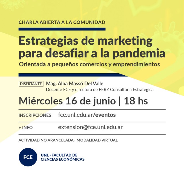 El miércoles 16 de junio a las 18hs se llevará a cabo la charla abierta a la comunidad: "Estrategias de marketing para desafiar a la pandemia", orientada a pequeños comercios y emprendimientos.