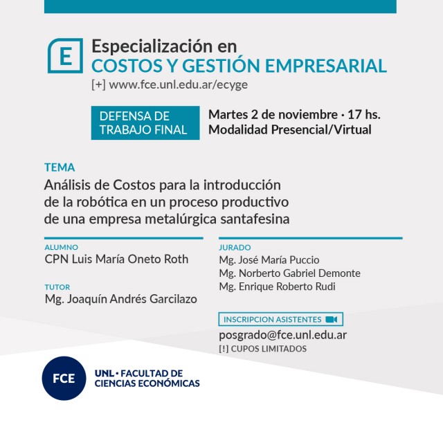 El martes 2 de noviembre a las 17 hs se llevará a cabo la defensa de trabajo final titulado "Análisis de costos para la introducción de la robótica en un proceso productivo de una empresa metalúrgica santafesina", por el CPN Luis María Oneto Roth.