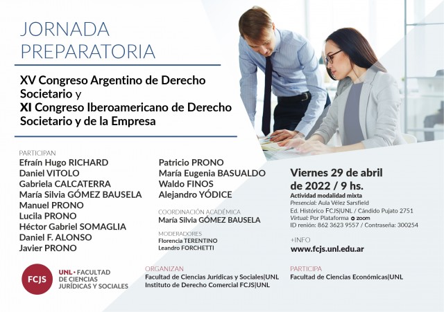El viernes 29 de abril, a partir de las 9:00, se llevará a cabo la Jornada Preparatoria del XV Congreso Argentino de Derecho Societario y XI Congreso Iberoamericano de Derecho Societario y de la Empresa. La actividad es organizada por el Instituto de Derecho Comercial de la Facultad de Ciencias Jurídicas y Sociales (FCJS).