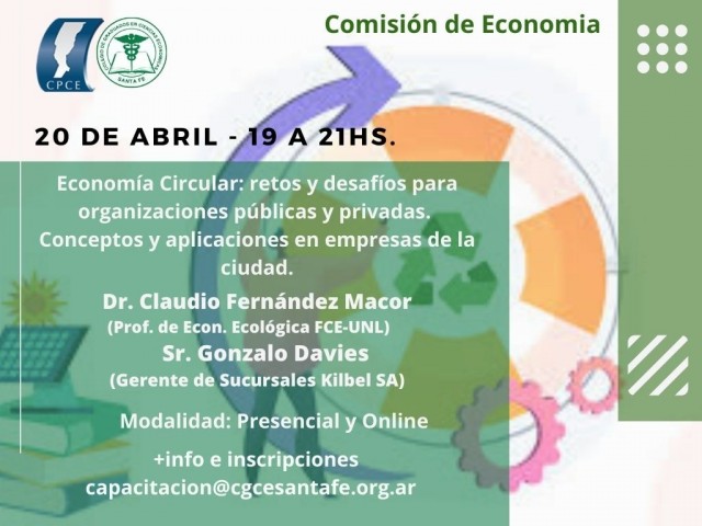 La comisión de Economía del Colegio de Graduados en Ciencias Económicas, invita a participar de la charla "Economía circular: retos y desafíos para organizaciones públicas y privadas. Conceptos y aplicaciones en empresas de la ciudad".